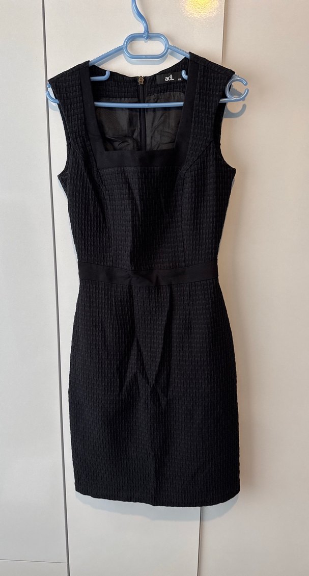 Siyah, kolsuz midi elbise, kemer detaylı ve klasik ofis tarzına uygun kesimlidir. Notlu yaka ve oturan modelle tasarlanmıştır.