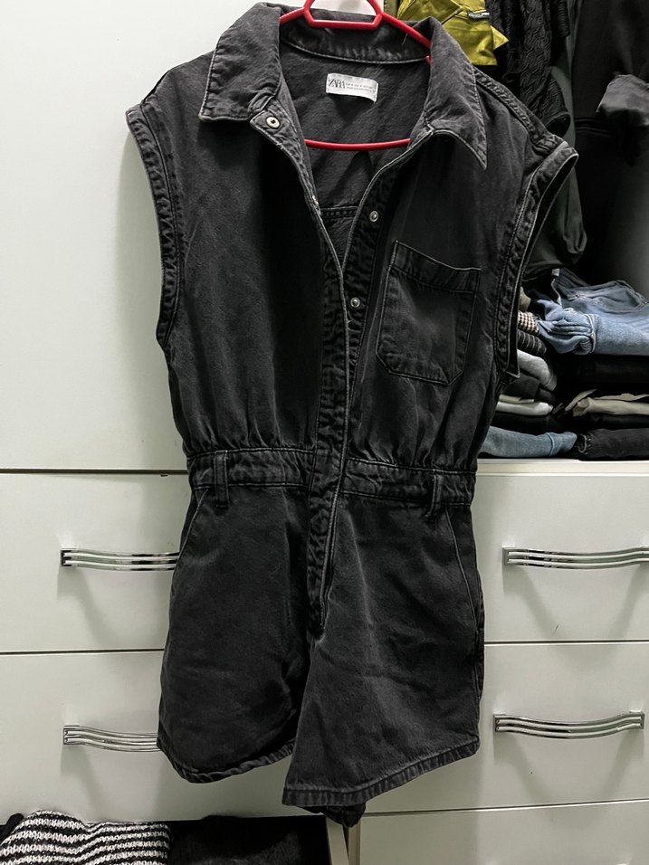 Siyah Kemerli Kolsuz Denim Tulum