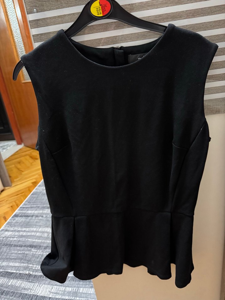 Kolsuz, kemerli siyah bluz, dar kesim ve yuvarlak yakalı. Suni kumaştan, sokak stili ve günlük kullanım için uygundur.