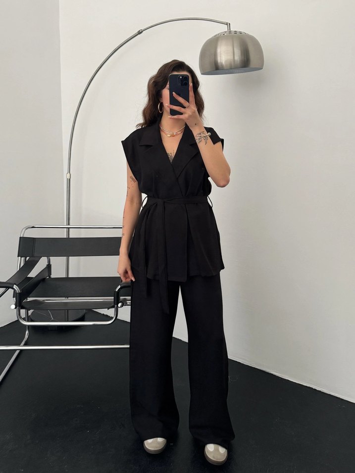 Siyah Kemerli Kolsuz Kadın Takım