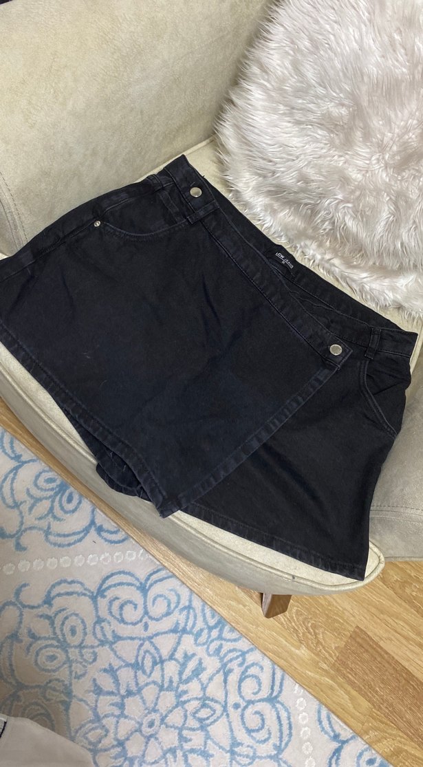 Siyah renkli, kemerli ve bol kesim mini denim şort, gündelik kullanıma uygun rahat ve trend görünümlü.