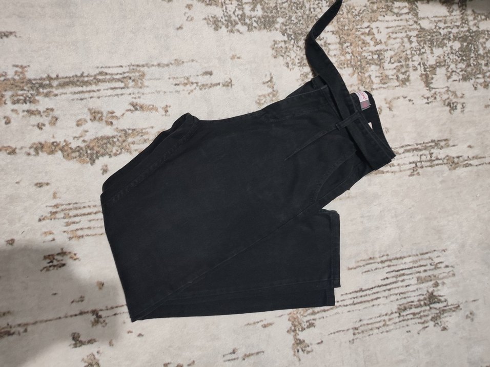 Siyah denim kumaştan, kemerli ve normal kalıplı midi uzunlukta kadın pantolon. Sokak tarzı ve günlük kullanıma uygun rahat bir model. bel basen ve boy ölçüsü fotoğraflarda var çok güzel yumuşak bı kumaşı var esneme yok