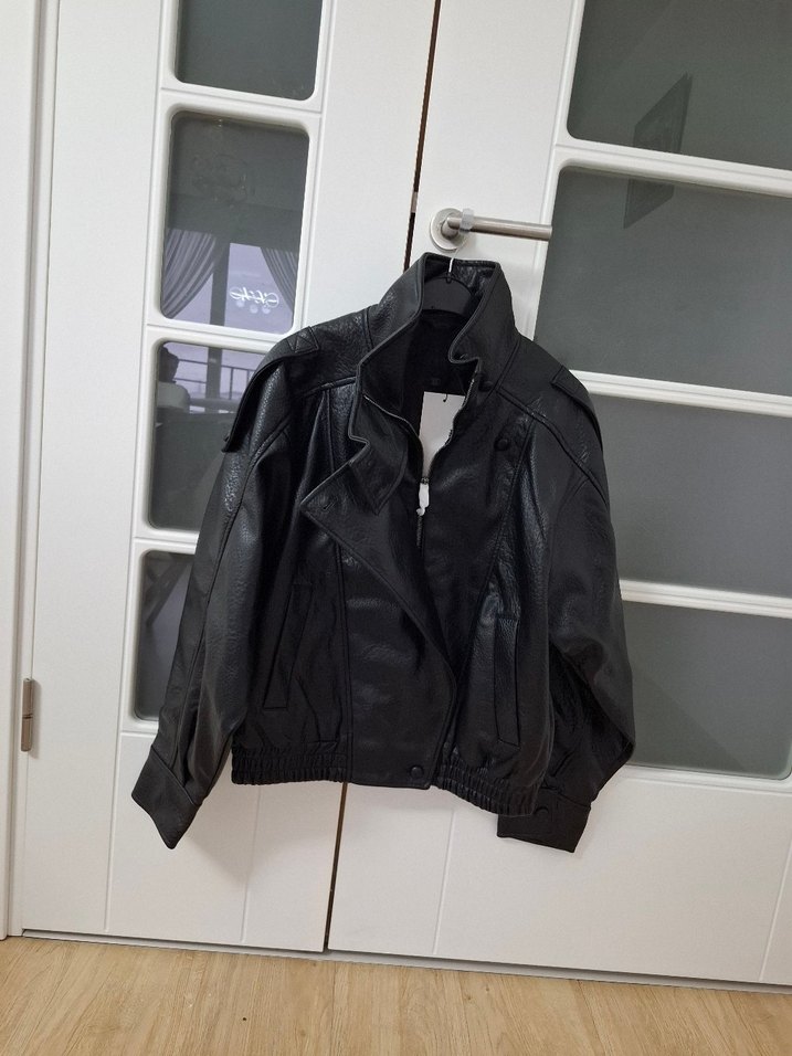 Siyah deri biker ceket, kemerli bel, kesik yaka ve uzun kollu tasarıma sahiptir. Salaş kesim ve midi uzunluktadır, sokak stiline uygundur.