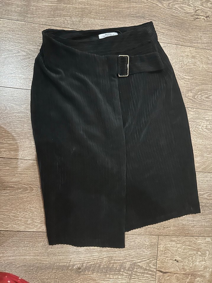 Siyah renkli, kemerli ve midi boyda.Rahat kesimi ve yumuşak sentetik kumaşı ile ofis ve günlük kullanıma uygundur. Siyah fitilli kadife etek. Çok şık. Yeni.