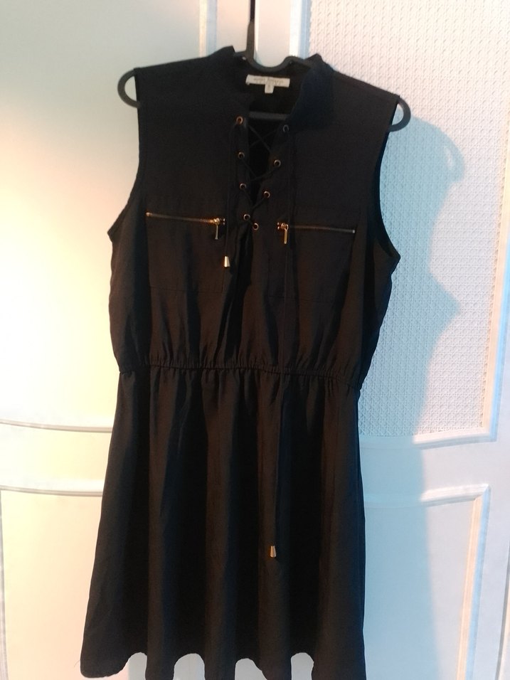 Kolsuz, yüksek yakalı siyah midi elbise. Kemerli ve fermuarlı detaylı, sentetik kumaştan günlük kullanıma uygun.