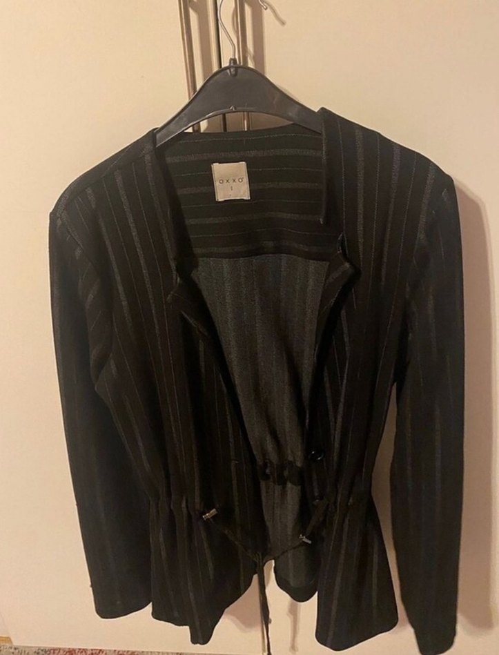 Siyah, kemerli midi uzunlukta kadın blazer. Notlu yaka, uzun kollu ve regular fit. Ofis için uygun, ince çizgili ve sentetik kumaştan.