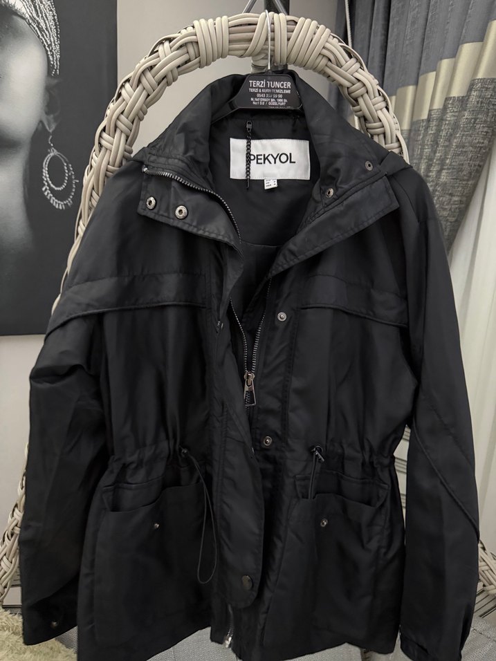 Siyah kemerli, notched lapel yakalı ve uzun kollu kadın ceketi. Gevşek kesim ve midi boyda, sentetik kumaştan üretilmiştir. Günlük kullanım ve sokak stili için uygundur.