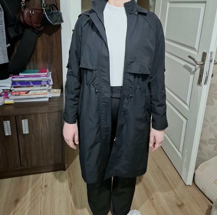 Siyah renkli, kemerli midi boy kadın yağmurluk. Bol kesim, kırlangıç yaka ve uzun kolludur. Sentetik kumaştan üretilmiştir, günlük sokak stiline uygundur. ☔