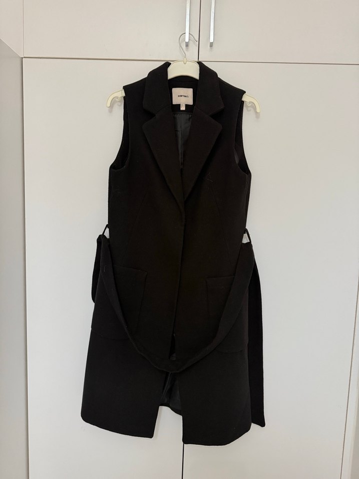 Siyah kumaştan kemerli, kolsuz ve normal uzunlukta midi yelek. Ofis için uygun, regular fit ve keskin yakalı.