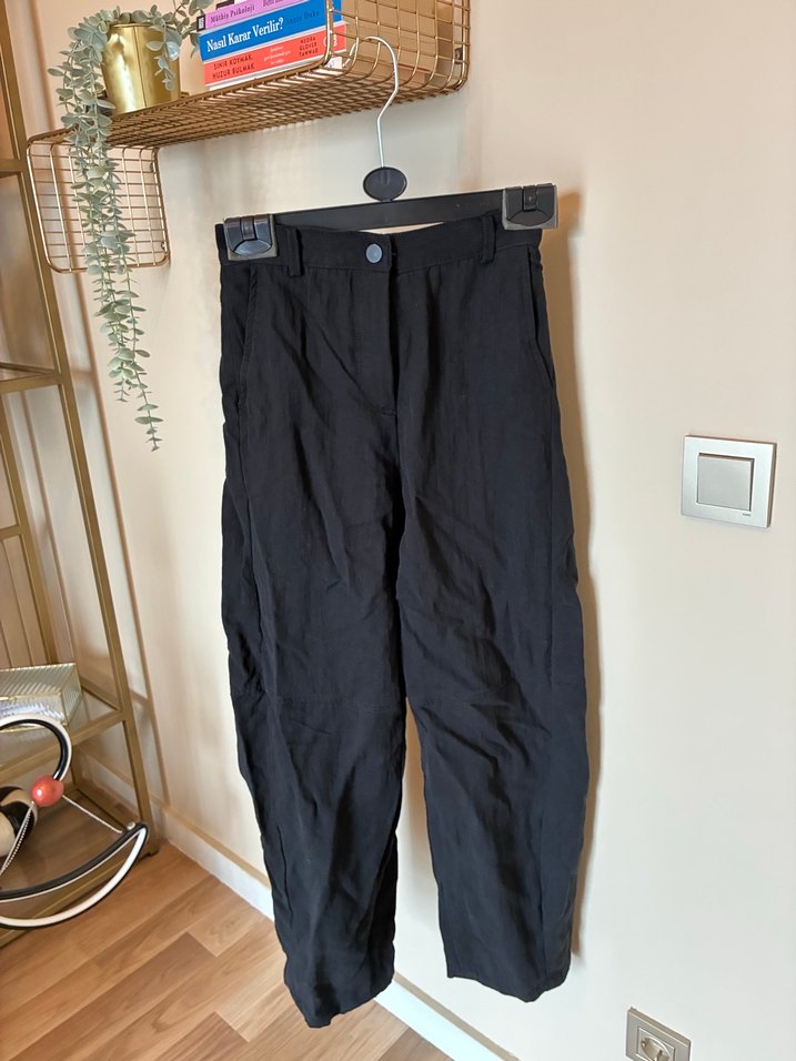 Bu siyah keten pantolonlar, kemerli bel ve midi boyuyla rahat, salaş bir kesime sahiptir. Günlük kullanım için minimalist sokak tarzına uygundur.