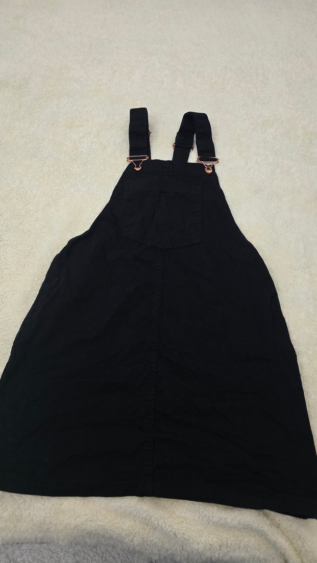 Siyah, kemerli ayarlanabilir askılı, yüksek yakalı midi kısa tulum, pürüzsüz sentetik kumaştan, gotik tarzda.