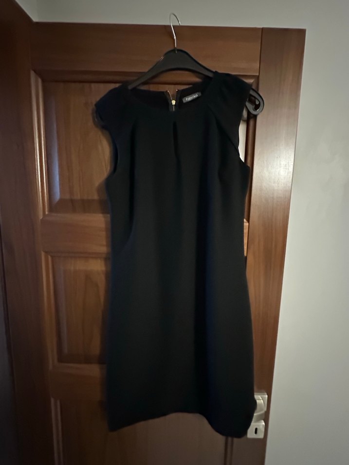 Siyah kemerli, V yaka ve kolsuz kesimiyle klasik ve şık bir ofis elbisesidir.