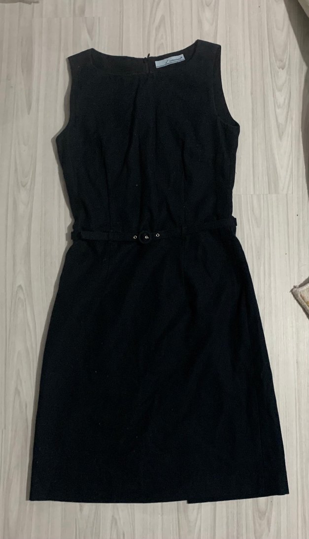 Kolsuz, yüksek yakalı siyah midi elbise, kemerli ve minimalist goth tarzında. Ofis için uygun, rahat kesim.