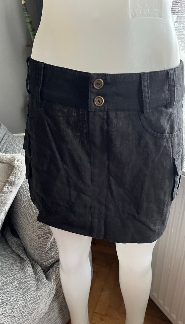 Siyah kot kumaştan, kemerli ve bol kesim midi etek, günlük ve gotik tarz için uygundur.