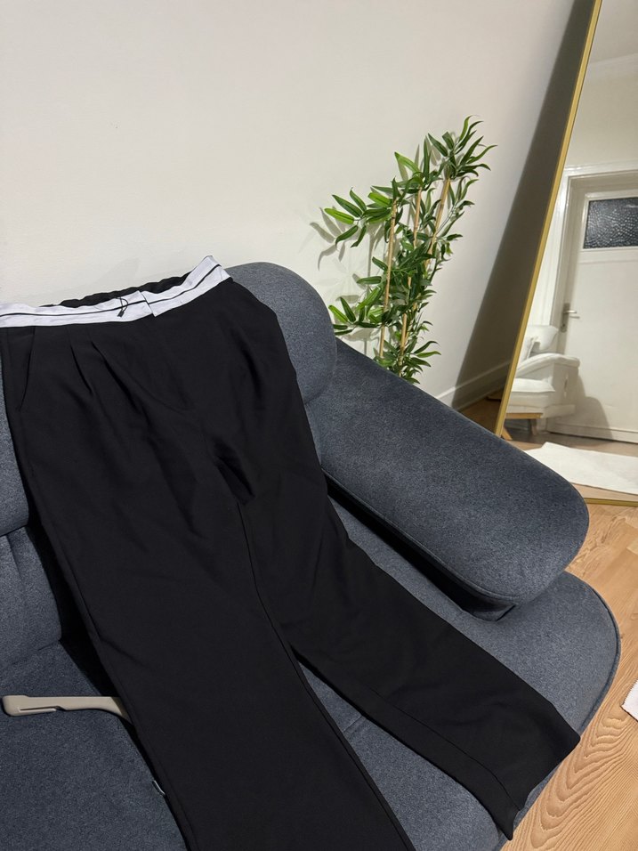 Siyah, kemerli ve midi boy kadın pantolonu, rahat kalıplı ve sentetik kumaştan günlük kullanıma uygun.