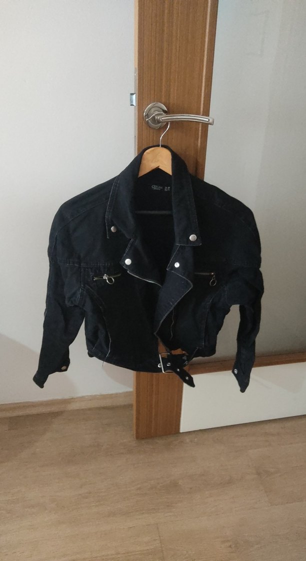 Siyah renkli, kemerli ve kısa kesim olan bu dar kesim denim ceket, yakasında çentikli detay ve askılı kollara sahiptir. Günlük kullanıma uygundur.