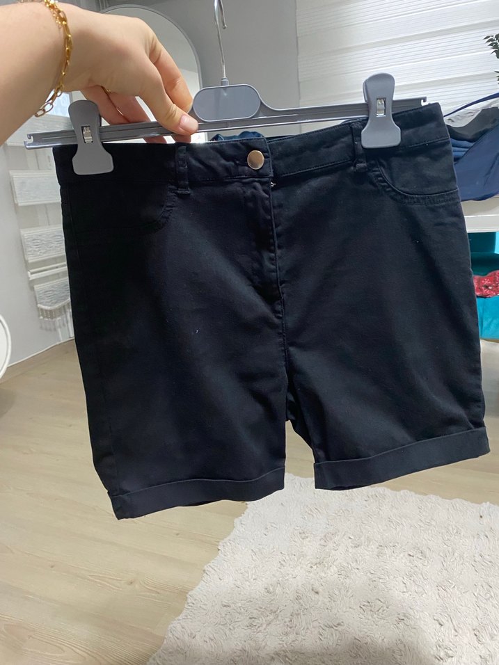 Kemerli, siyah denim mini şort. Sade desensiz, rahat ve şık günlük sokak stili için uygundur. Kısa boy ve dar kesim.