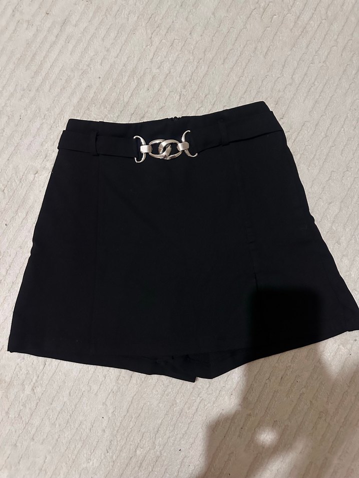 Siyah, kemerli ve dar kesim mini etek. Sentetik kumaştan yapılmış, gündelik ve trend tarzlar için uygundur.