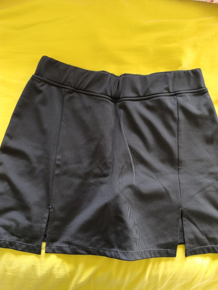 Siyah kemerli, ön yırtmaçlı, sentetik kumaştan yapılmış dar kesim mini etek. Spor ve sokak modası için uygundur. Altı şortludur. Hiç giyilmedi.