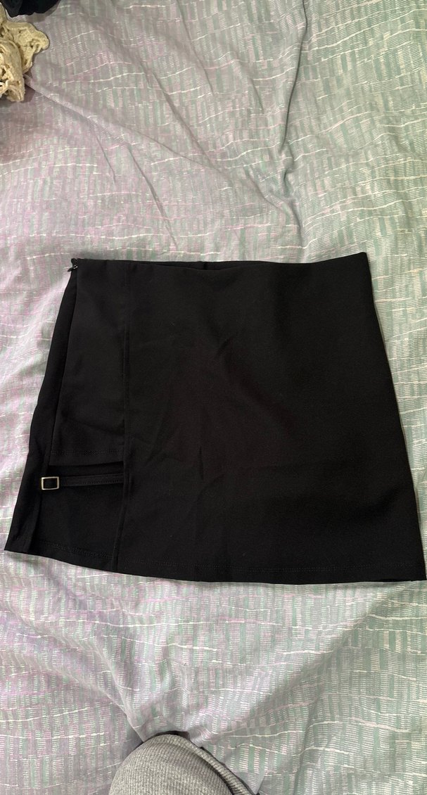 Siyah renkte, kemerli ve normal boyda, düz kesim sentetik kumaştan mini etek. Günlük kullanıma uygun minimalist tarzda.