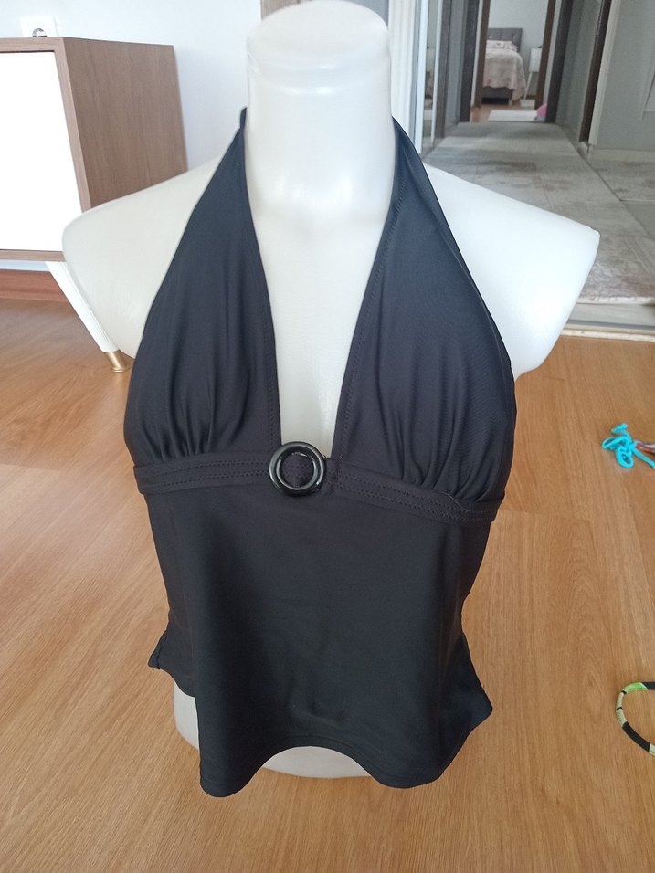 Siyah renkli, kemerli ve mini boyda, kolsuz, vücuda oturan gotik tarzda kadın mayo.