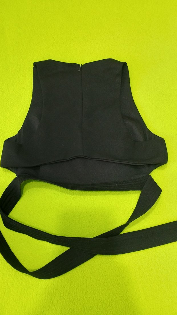 Sporcu yakalı, askılı kollu, kemerli ve kısa kesim siyah kadın büstiyer.Pamuklu kumaştan, fit kesim ve avant-garde gotik tarzda. Açık hava için uygun.