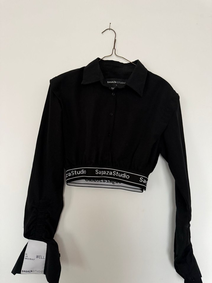 Siyah, uzun kollu, yakalı ve kemerli kısa kesim fitilli kadın gömleği. Sentetik kumaştan, günlük kullanıma uygun şık ve rahat bir parça.