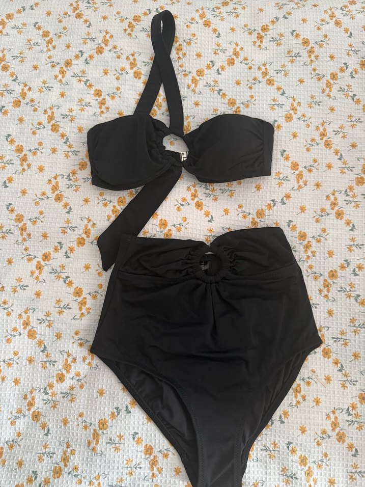 Fıt kesim siyah kadın mayosu, kemerli ve askılı üst kısmı ile yüksek bel alt parçaya sahiptir. ️