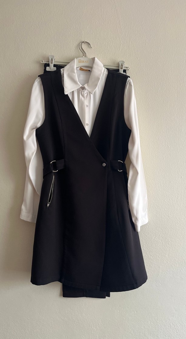 Siyah mini ofis elbisesi, kemerli bel, kesik yaka ve askılı kollara sahip, yumuşak sentetik kumaştan yapılmıştır. Takım Gömlek Dahil Değildir
