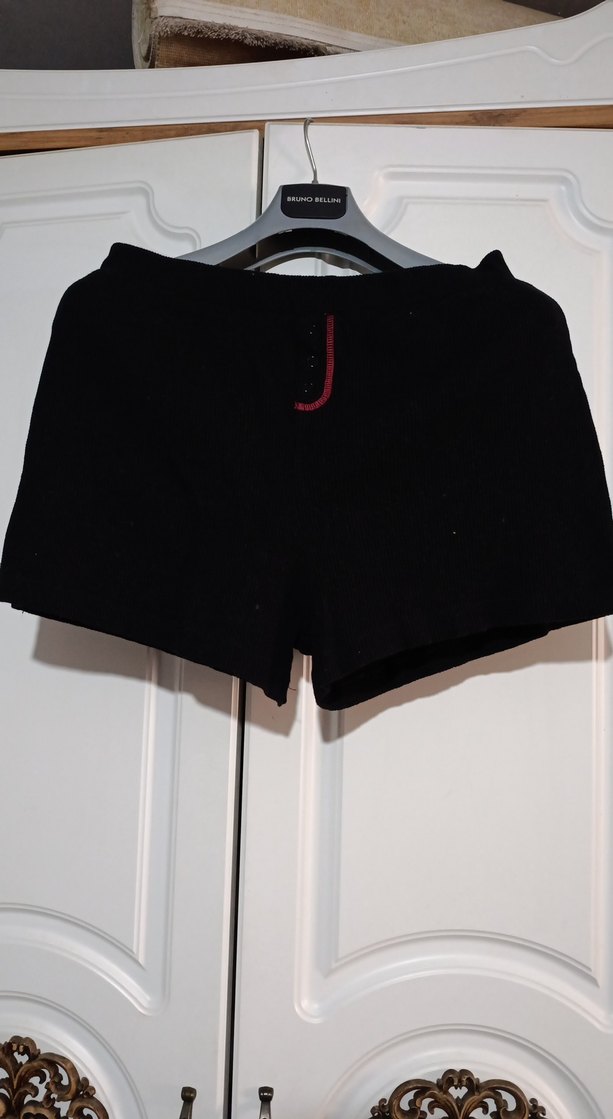 Siyah, kemerli, mini boy ve vücuda oturan şortu. Yumuşak ve sıcak kumaştan, cesur sokak stili ve athleisure görünümüne uygun. boy36