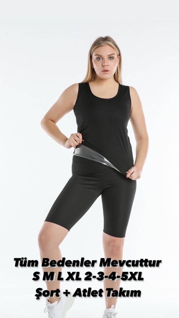 Siyah, kemerli ve parlak sentetik kumaştan yapılmış, kolsuz, dar kesim mini spor takımı. S'den 5XL'ye kadar tüm bedenler mevcuttur.