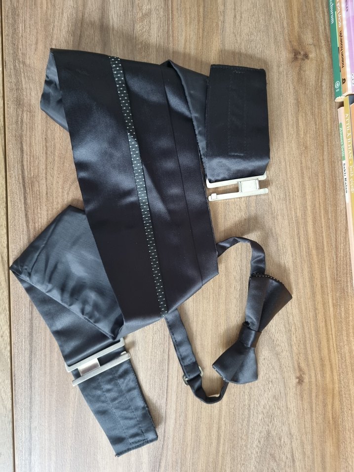 Siyah, kemerli ve desensiz, modern tarzda sentetik kumaştan yapılmış papyon seti, şık bir görünüm sunar. 1 defa kullanildi. 4 parçadan oluşan fiyattir.ceket,pantolon,papyon seti.