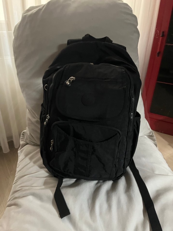 Siyah renkli, kemerli ve çoklu fermuarlı ceplere sahip kadın sırt çantasıdır. Sentetik kumaştan üretilmiş, günlük kullanıma uygundur.