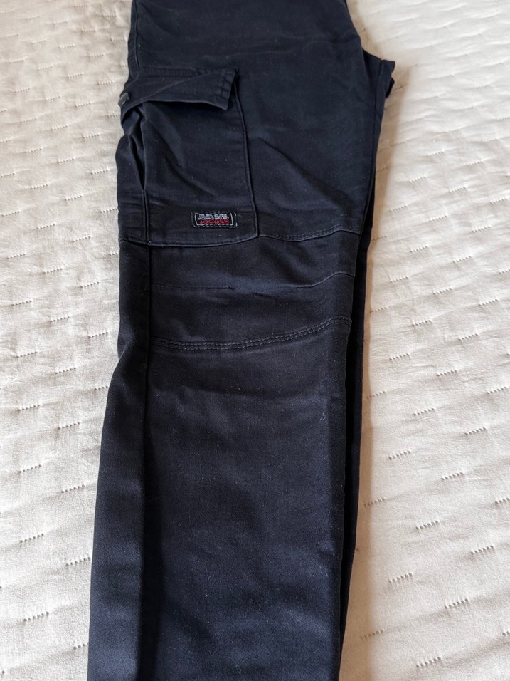 Siyah kot pantolon, bol kesim ve kemerli bel ile rahat bir kullanım sunar. Yan ceplerle sokak tarzına uygun, günlük kullanıma uygun normal boyda.
