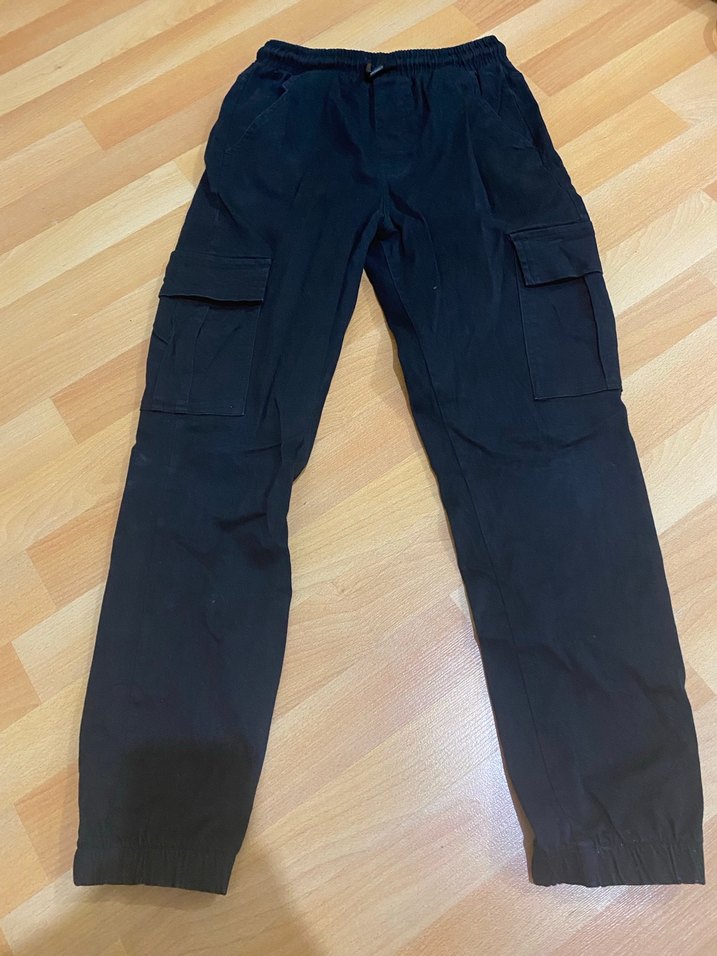 Siyah renkli, kemerli ve rahat kesim erkek pantolon. Denim kumaştan, midi boyda, günlük sokak stili için uygundur.