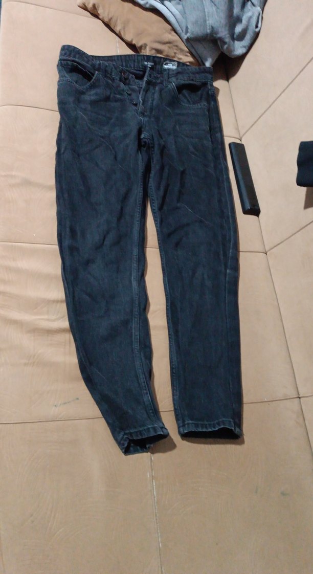 Siyah renkli, kemerli ve bol kesim kadın denim pantolon. Normal midi boyda, günlük sokak stiline uygun rahat bir model.