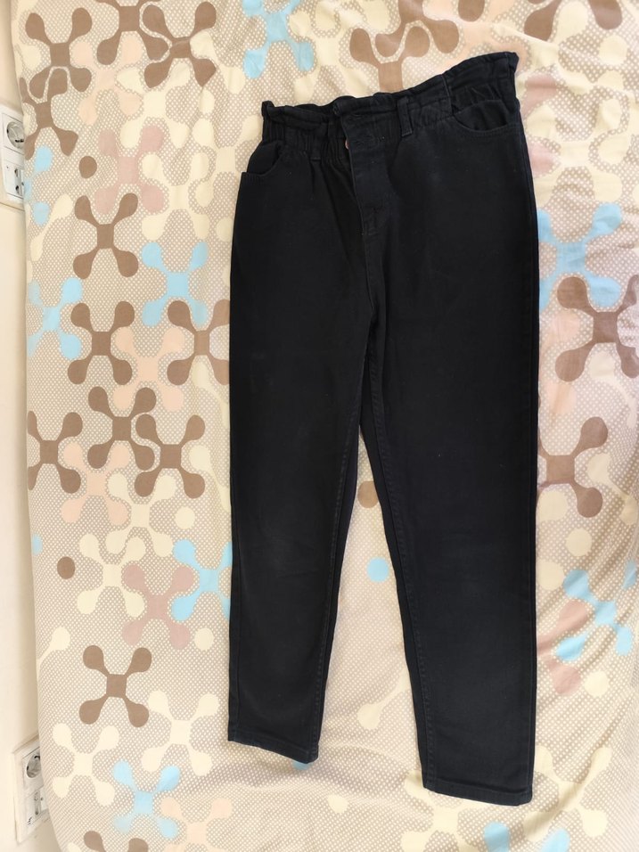 Siyah kot pantolon, rahat kesim ve kemerli bel detayına sahip. Günlük kullanım için uygun, midi boy ve desensiz tasarımıyla sokak stilini yansıtıyor.