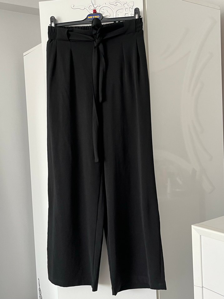 Siyah, kemerli ve rahat kesimli bu kumaş pantolonlar, ofis ve günlük sokak stili için uygundur. Midi boy ve minimalist tasarıma sahiptir. Cep kısmında hafif tüylenme var onun dışında hiçbşr kusuru yok