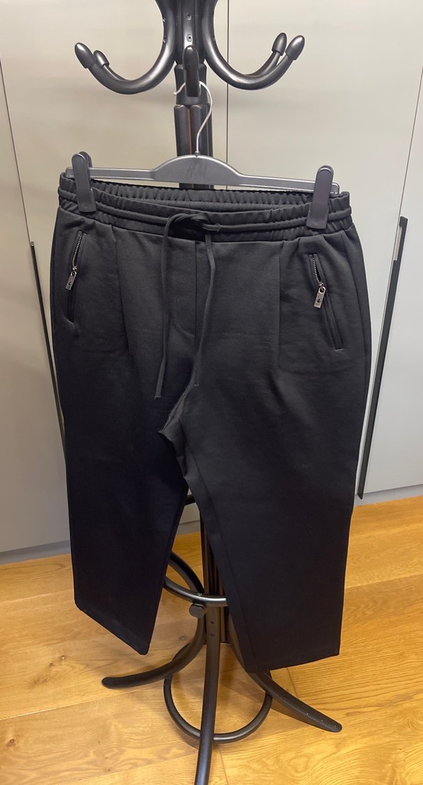 Siyah, kemerli ve fermuarlı cepli, sentetik kumaştan midi uzunlukta rahat kesim kadın pantolon. Günlük sokak tarzı için uygundur.