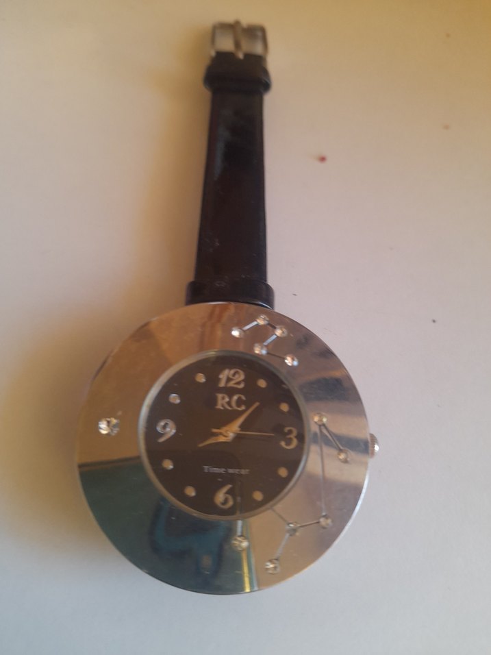 Siyah kemerli kayışa sahip bu kadın saati, yuvarlak kadranda 'RC' ve '12' rakamlarını gösterir. Takımyıldızı desenleri ve kristal süslemelerle gotik bir tarz sunar. ⌚
