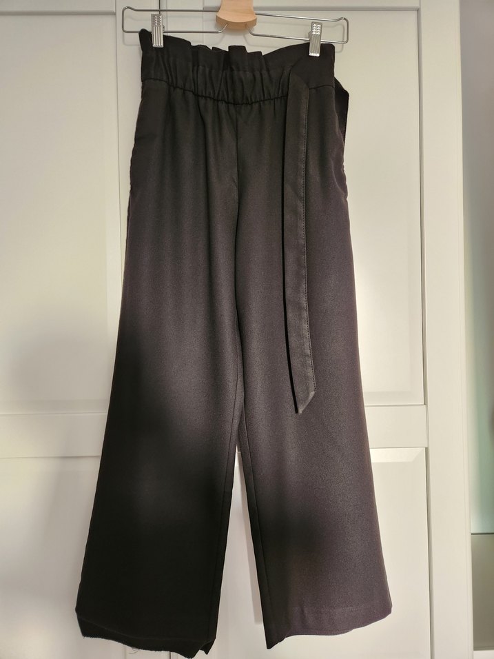 Ürün siyah yandan bağlamalı bir kemeri bulunan ve beli lastikli bir kumaş pantolon. Fotoğrafları güneşli bir anda çekmişim. Görüntüler sizi yanıltmasın rengi simsiyah bir ürün. Ayrıca ürün terzi işlemi görmedi. Boyum 160 ben 6 cm topuklu ile bir gece özel bir günde kullanmıştım. Günlük kullanıma ve ofis stiline uygun. Yalnızca paçanın birisinin dikişi açıldı. Bir daha da kullanmadım. Yıkandı ve ütülendi. Alıcısını bekliyor.