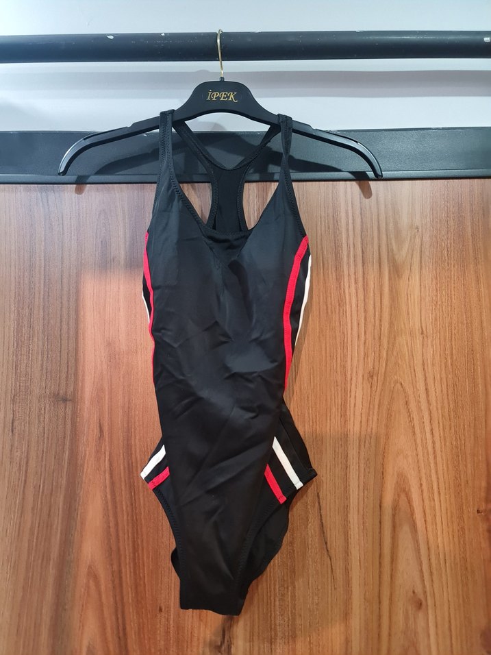 Kemer detaylı, ince askılı siyah mayo, kırmızı ve beyaz yan çizgilerle sportif ve sokak tarzı bir görünüm sunar. ♀️