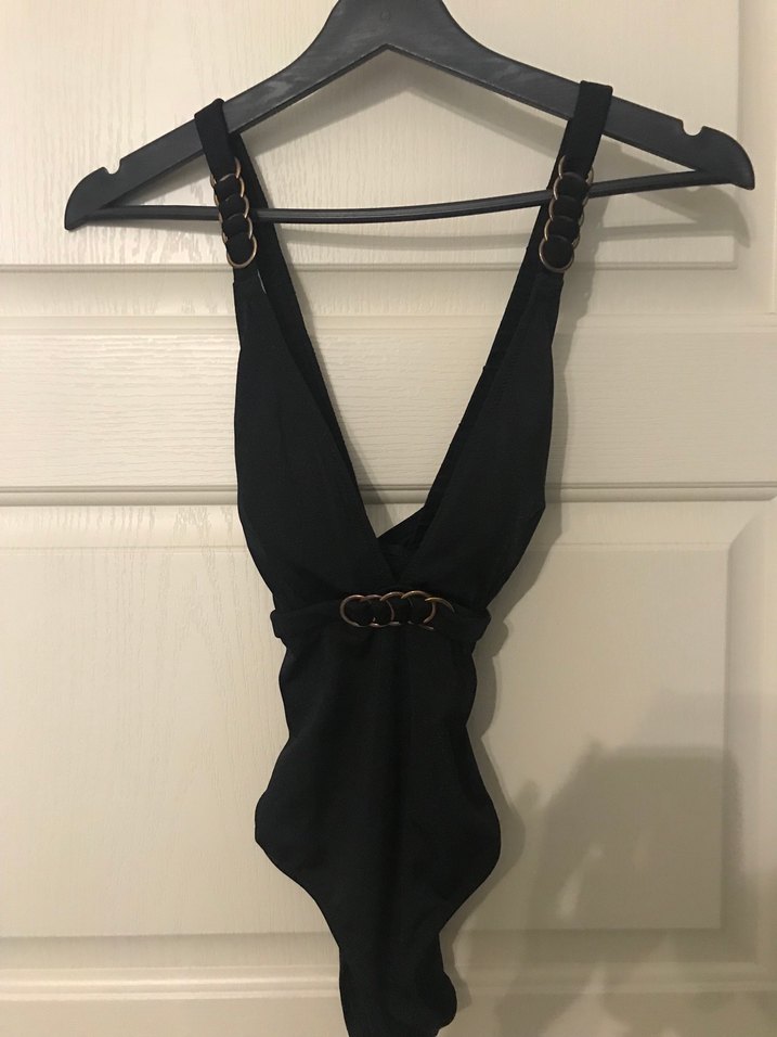 Bu siyah, kemerli ve halkalı detaylı strappy askılı mayo, minimalist gotik tarzıyla günlük kullanıma uygundur.