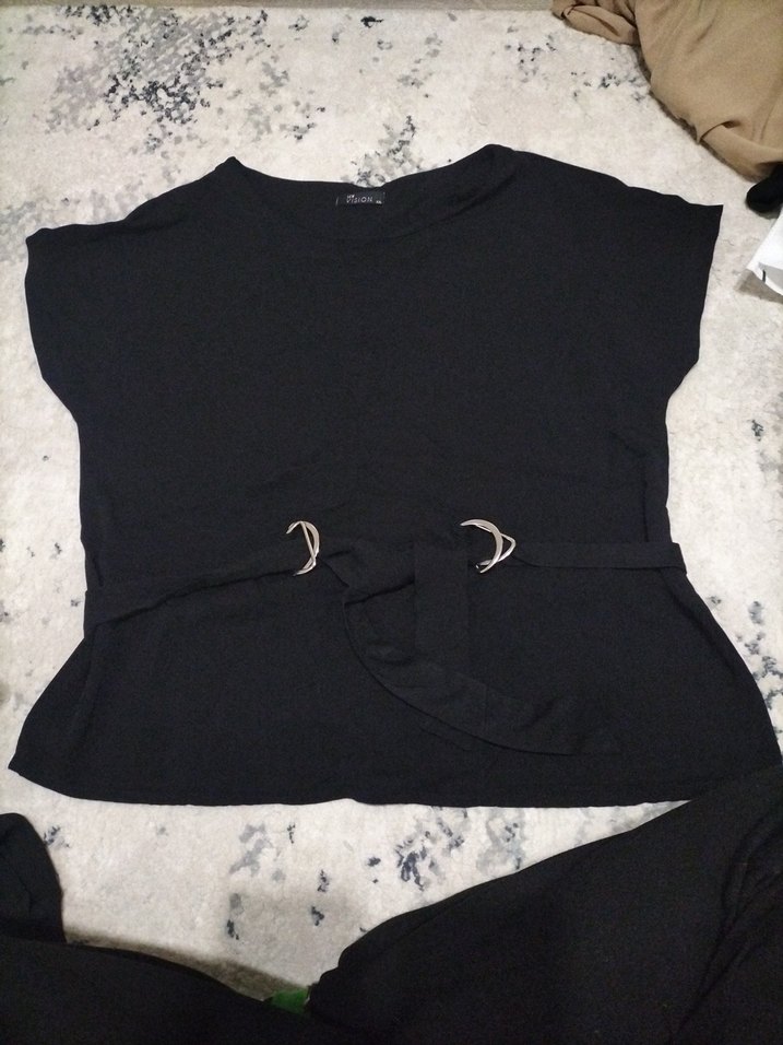 Siyah kemerli, bol kesim, yuvarlak yaka ve kısa kollu tişörtü. Mini uzunlukta, gündelik ve goth tarzına uygun.