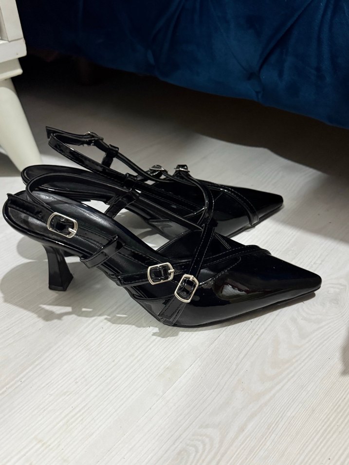 Siyah renkli, kemerli ve yılan derisi desenli kauçuk stiletto topuklu ayakkabı, gotik klasik zarafet stiline uygun. Sorunsuz sıfır 38 numara