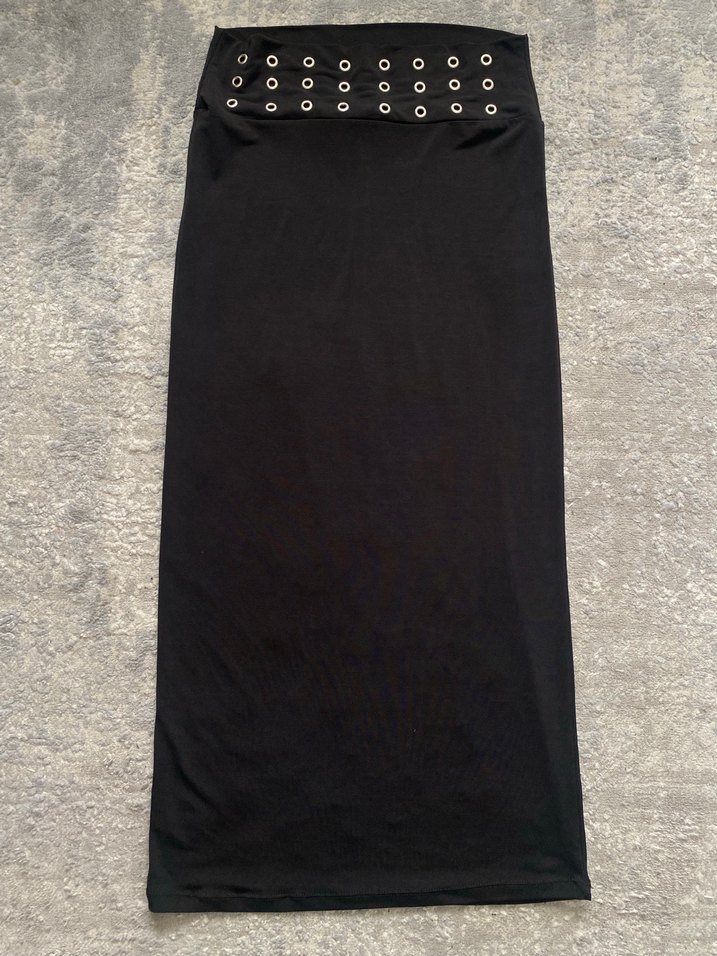 Siyah, kemerli ve metal halkalı bel detayı olan uzun, dar kesim goth etek. Düz ve sentetik kumaştan, günlük kullanıma uygun.