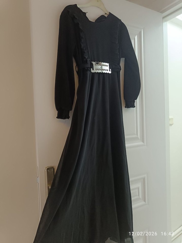 Yumuşak sentetik kumaştan yapılmış, yüksek yakalı ve askılı kollu siyah uzun elbise. Bol kesim ve kemerli, günlük kullanım için gotik tarzda. Pazarlık mevcyttyr