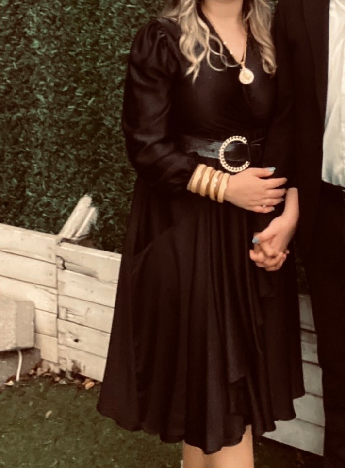 Siyah, şık kemerli uzun elbise, satenimsi kumaş, yaka detaylı ve askılı kollu. Gotik tarzda, düğün gibi özel anlar için uygun.