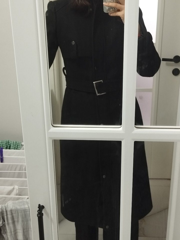 Siyah renkli, kemerli ve düğme detaylı uzun kaban, şık ve yapılı bir görünüm sunar. Giyen 175 - 65