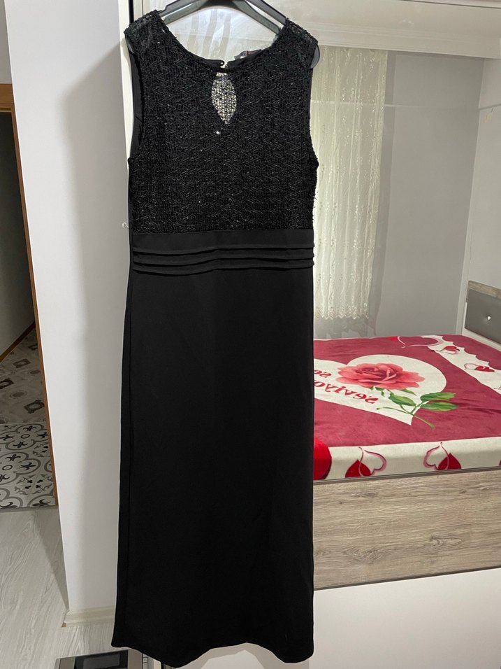 Siyah, kolsuz, V yakalı, kemerli ve uzun kesimiyle klasik ve gotik tarzı birleştiren abiye elbise. Romantik akşamlar için ideal, desensiz ve şık görünümlü.